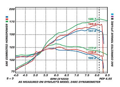 BLUE LINE - B18C STOCK RED LINE - B18C + SKUNK2 STAGE 1 CAMS GREEN LINE - B18C + SKUNK2 STAGE 1 CAMS + INTAKE MANIFOLD